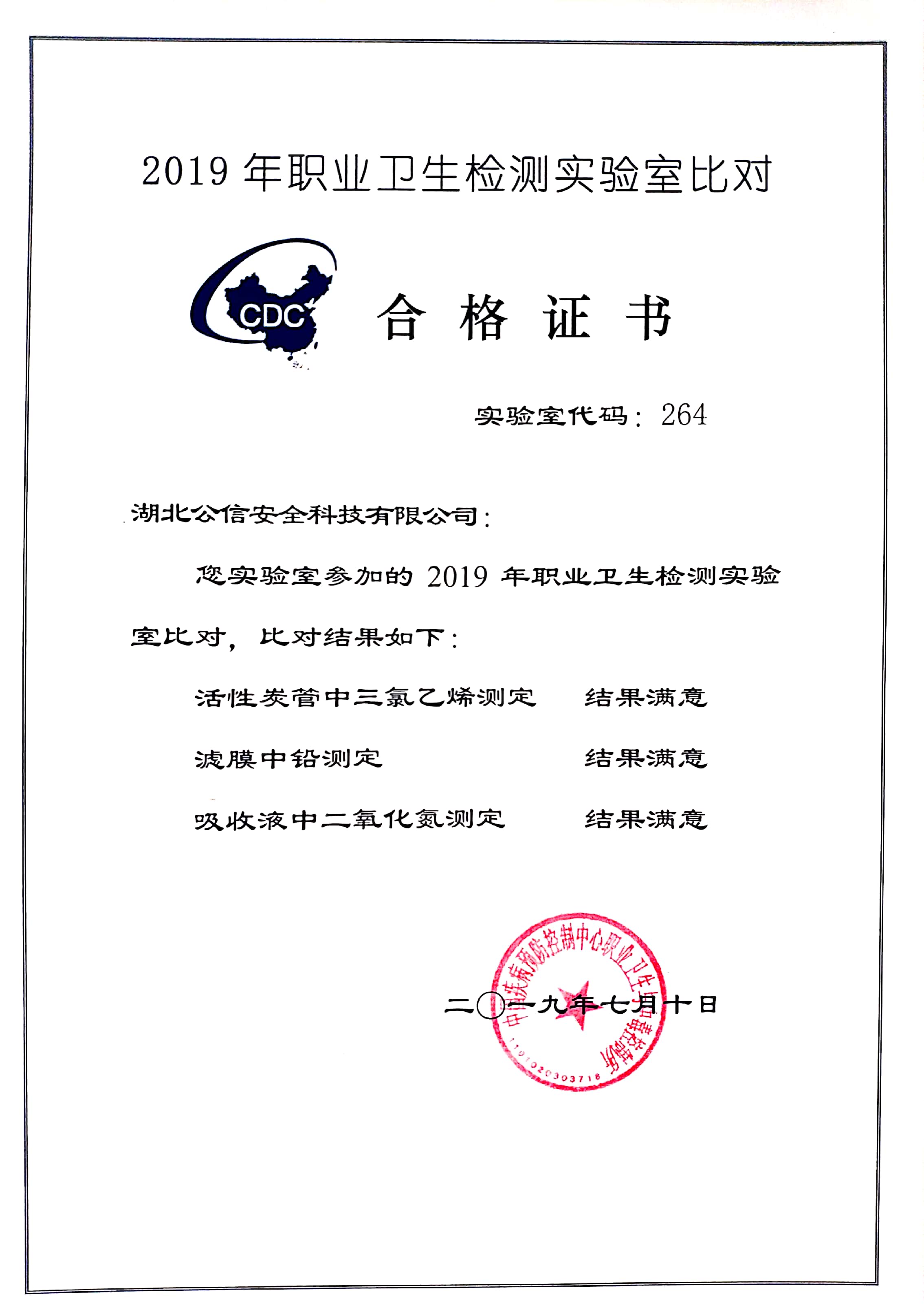 2019年7月10日,湖北公信安全科技有限公司在中國疾控中心組織的實驗室能力比對活動中取得三項檢測結(jié)果均為“滿意”的成績。